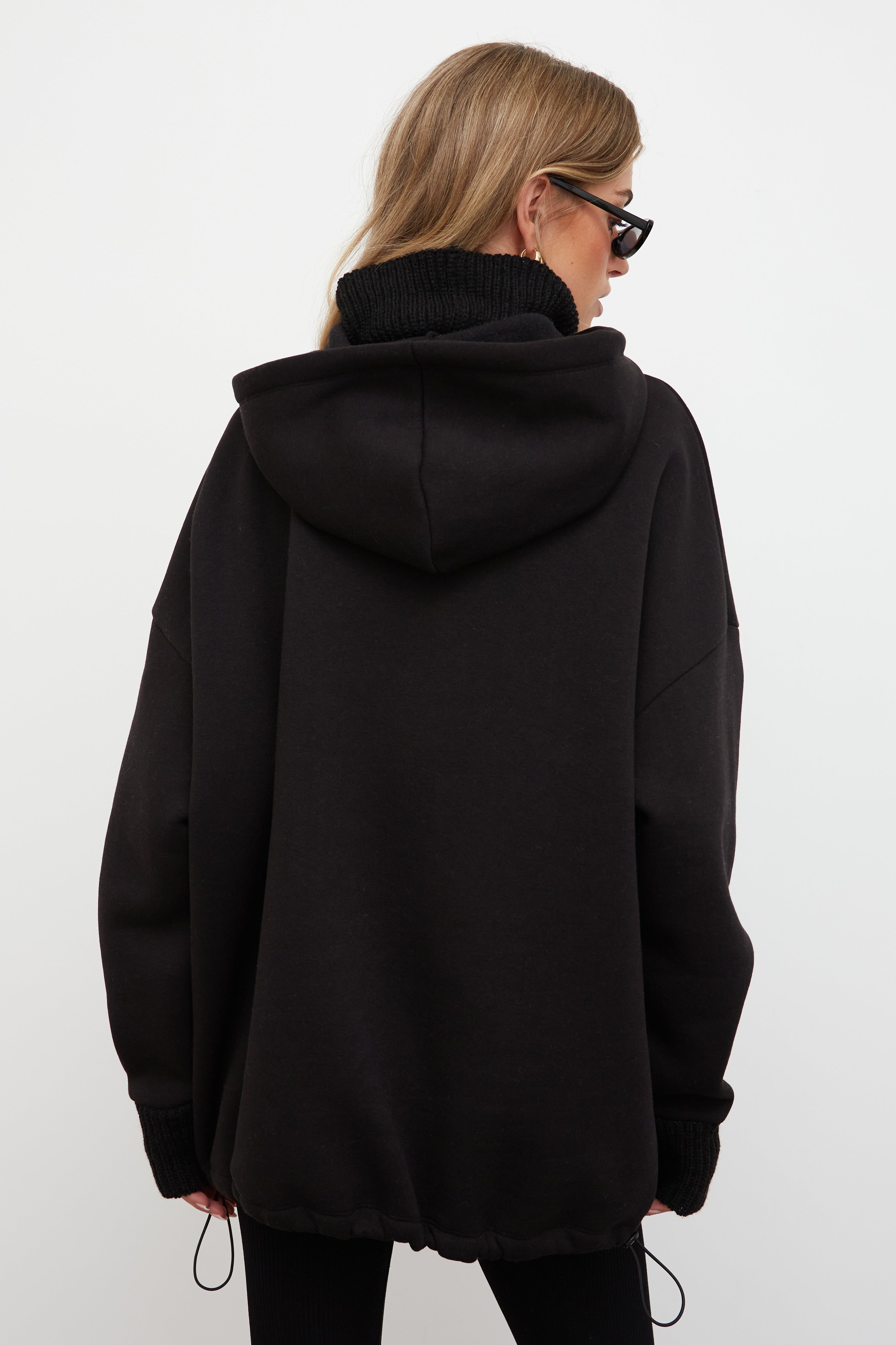 The hood offers additional coverage, while the knit detailing on the shoulders and sleeves adds a modern and textured element to the overall design.