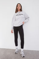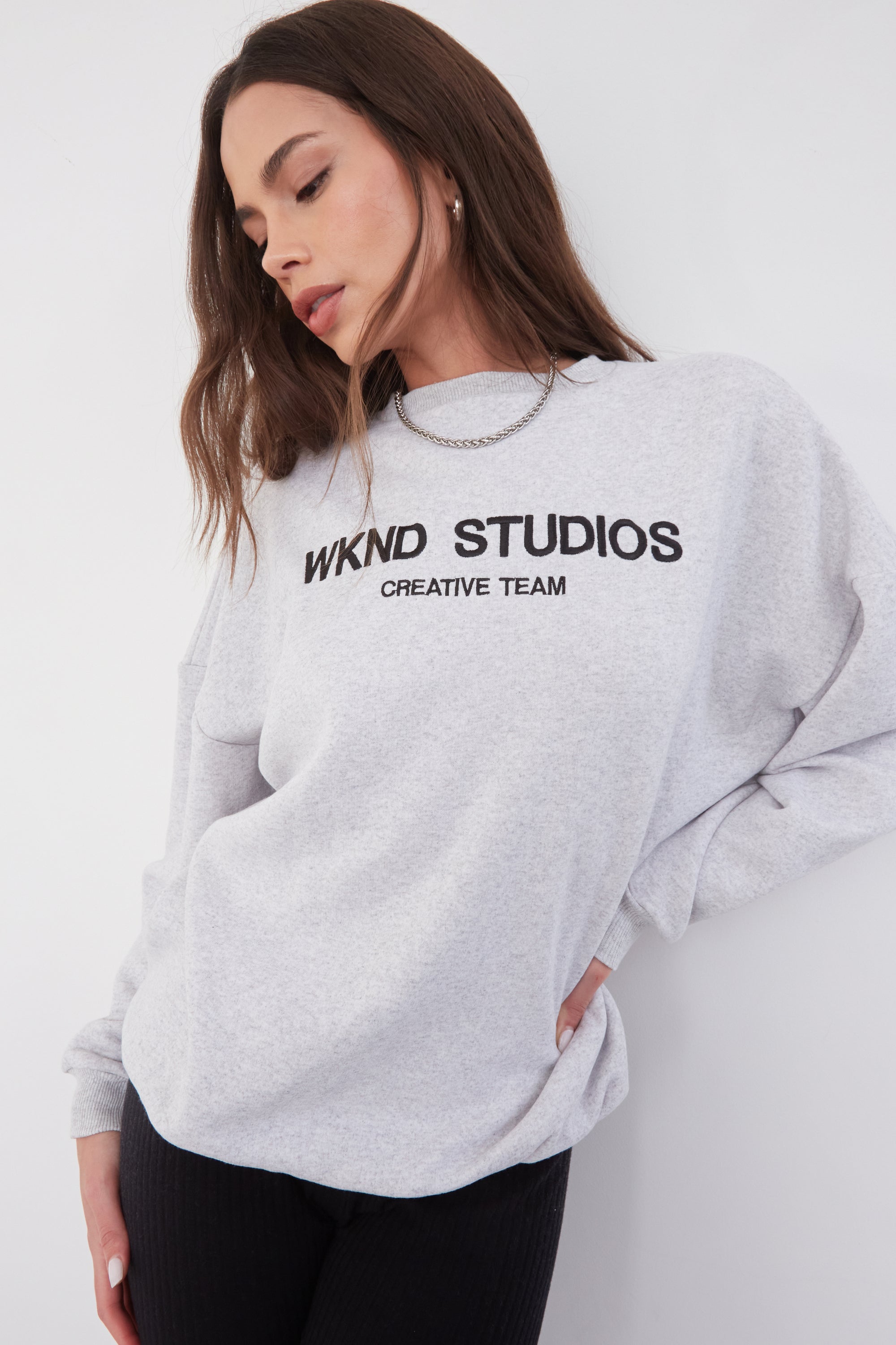 Our Wknd Studios Oversized Sweatshirt is made from a super soft cotton fabric perfect for the cooler season. It has an oversized fit, dropped shoulders and relaxed feel. Featuring a embroidered-graphic on the chest. Style yours with matching sweat pants or with leggings for an athleisure look.