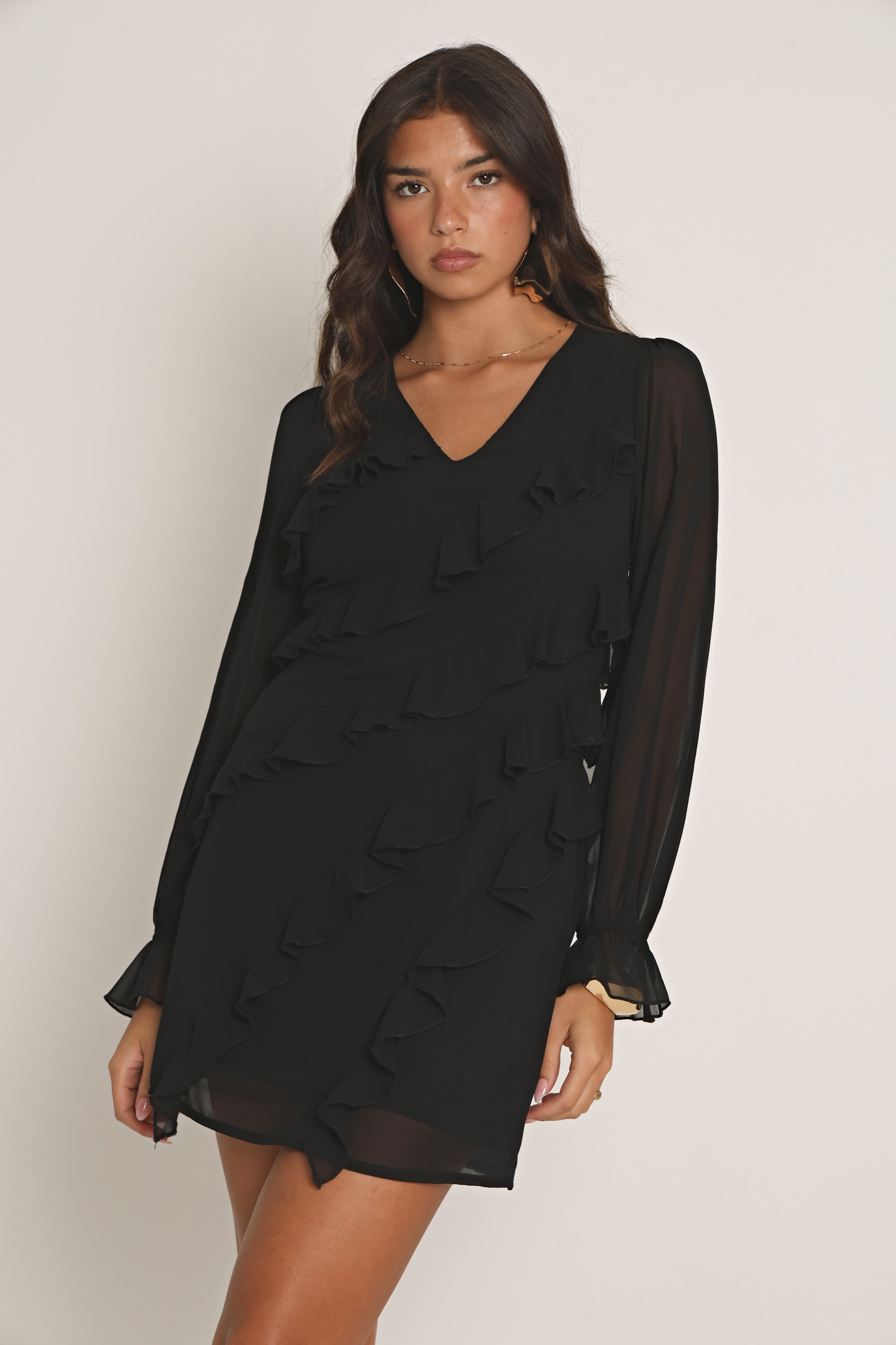 The fitted bodice of the dress enhances your shape, while the mini length provides a youthful and stylish vibe. The ruffles, combined with the sheer chiffon, offer a playful contrast to the dress’s sleek silhouette.